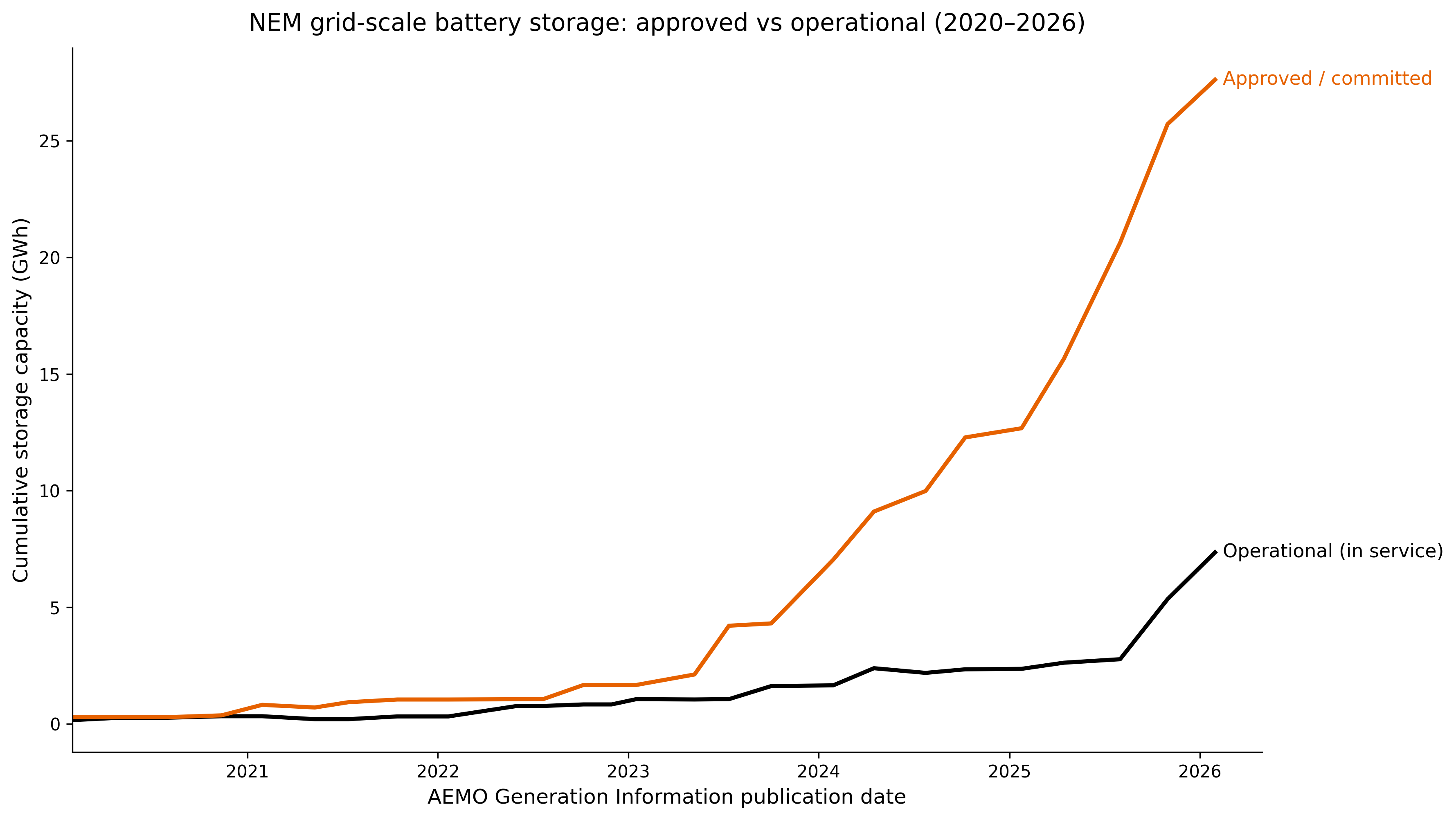 For years, critics said grid‑scale batteries were marginal—fine for FCAS, maybe for two‑hour arbitrage, but ultimately a subsidy‑led project that collapses the moment prices get difficult. Seen in aggregate, the battery wave has been building for five years: the approved/committed pipeline has pulled well ahead of the operating fleet, and the gap has been widening. The burst of ~15 GWh listed above lands on top of that trend — which is why the “batteries are marginal” argument no longer fits the numbers.