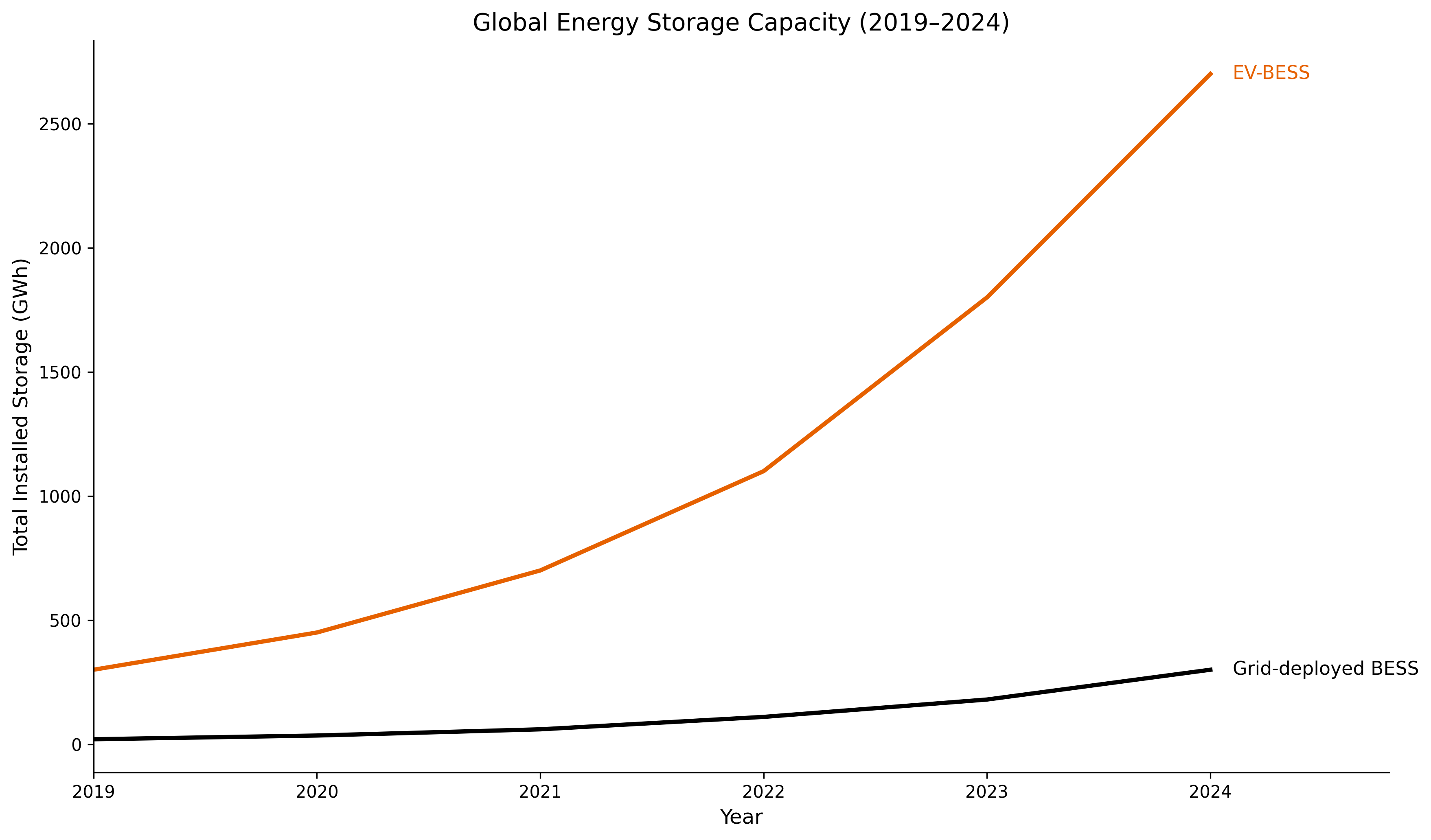 Over the past five years, EV battery capacity has grown from roughly 300 GWh to nearly 2,700 GWh globally. Grid-deployed BESS, while expanding rapidly, remains an order of magnitude smaller. The centre of gravity in energy storage is not in substations — it is in vehicles. Even if only a fraction of that mobile capacity becomes dispatchable, the system implications are structural.