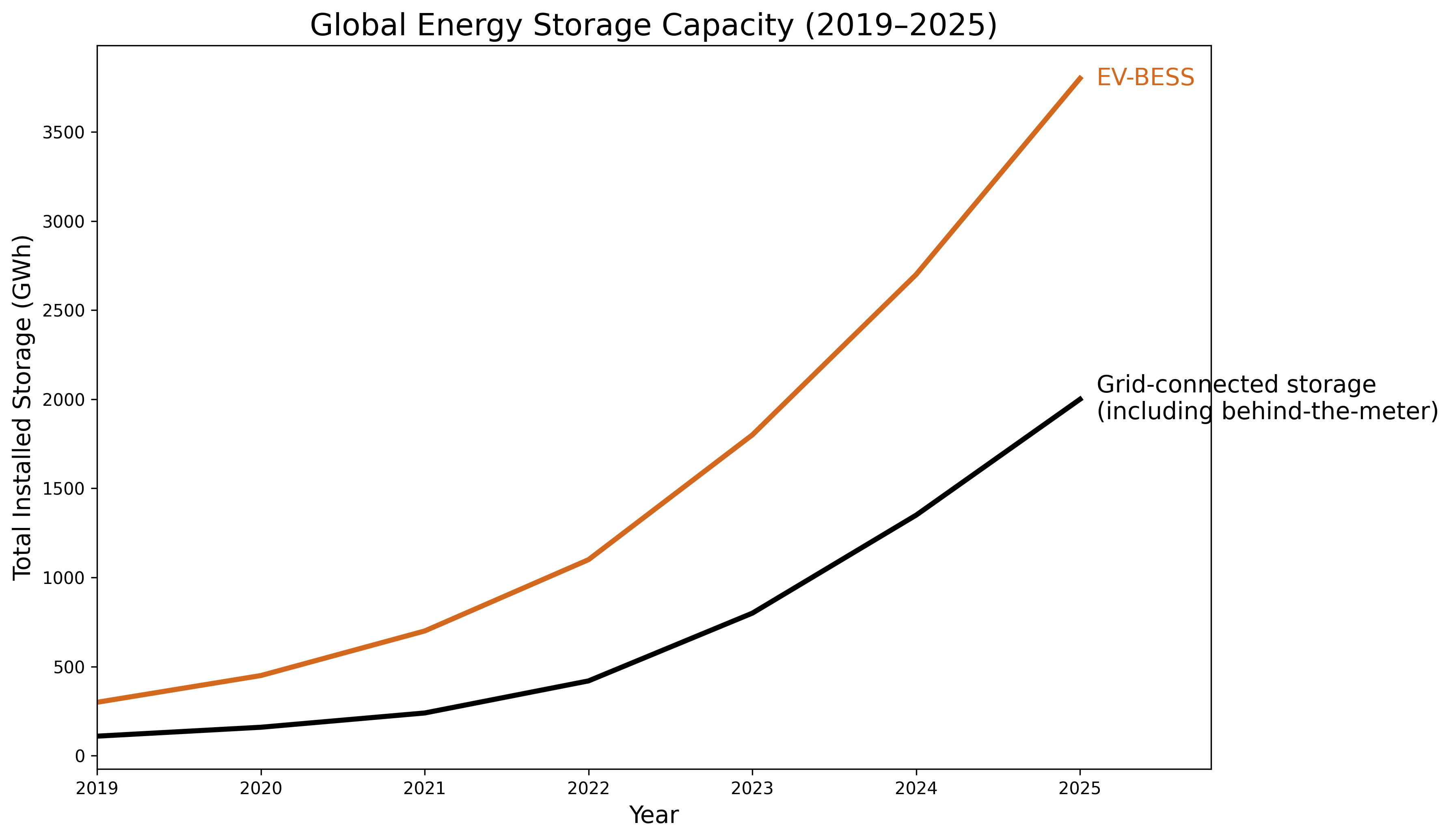 Over the past five years, global EV battery capacity has grown from roughly 300 GWh to nearly 2,700 GWh. Grid-deployed BESS is growing fast, but it is still an order of magnitude smaller. The centre of gravity in storage is not in substations. It is in vehicles. Even if only a fraction becomes dispatchable, the implications are structural.